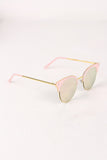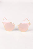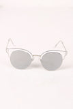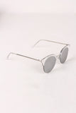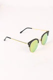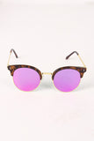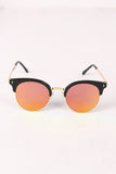 These clubmaster-style sunglasses feature a round mirrored lenses with plastic brow detail, metallic bottom frame, thin wire arms, and nose bridge cushions.