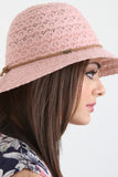 This sun hat features a cloche shape design, soft crochet knit with eyelet structure, braided vegan suede trimming decor, and inner ribbon sweatband. 100% Cotton.