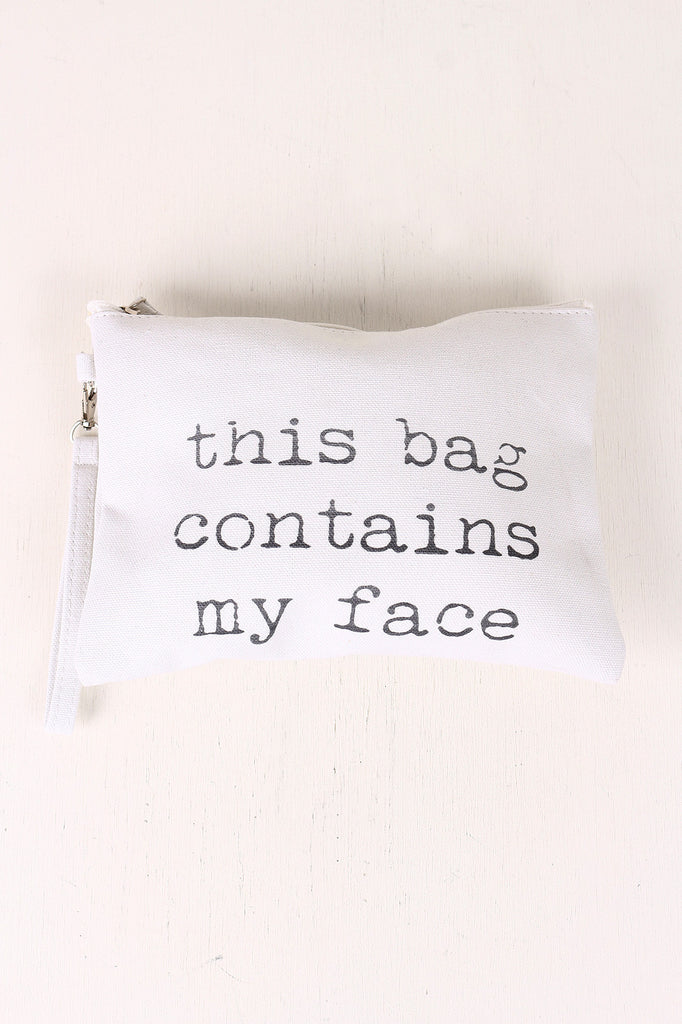 This cute bag features a canvas look, "this bag contains my face" printed on both sides, rectangle pouch shape, top zipper closure, full lining, and wrist strap.