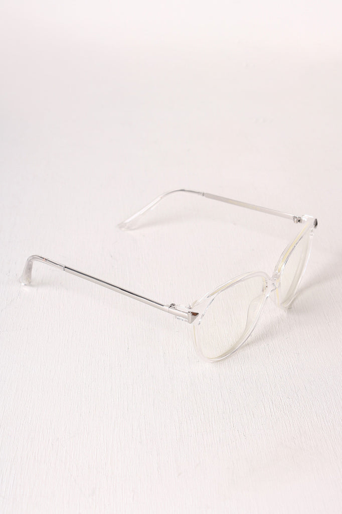 These retro glasses feature plastic trim frames, crystal clear lenses, and finished with slim metallic arms.
