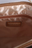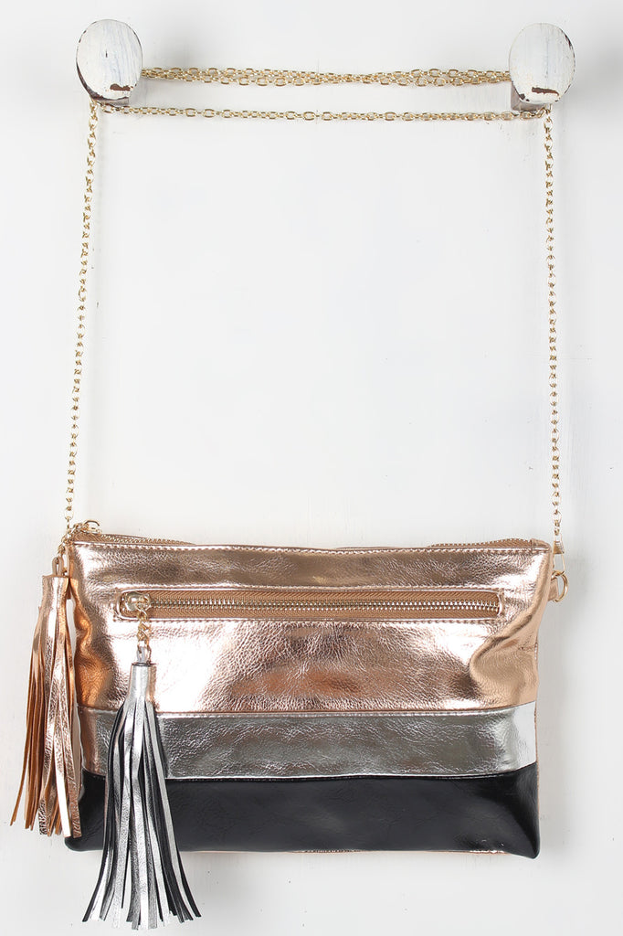This cute metallic crossbody bag features a vegan leather fabrication, tri-color design at front, front zipper pocket, and tassel accents. Finished with a top zipper with full lining, single zipper pocket, and a removable chain shoulder strap (24" drop).