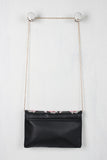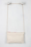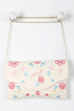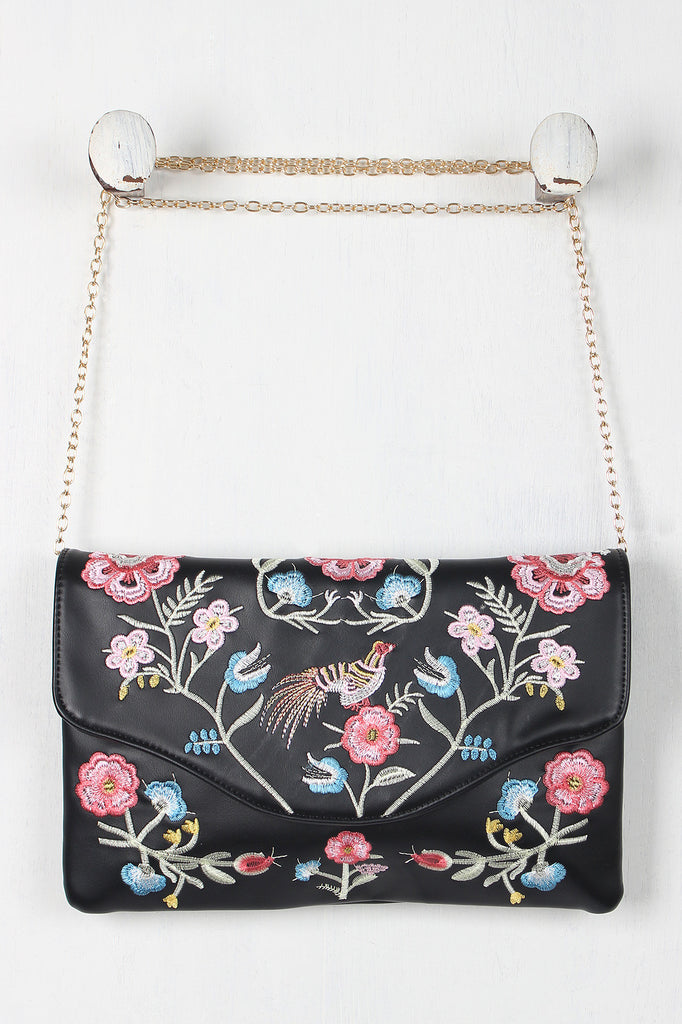 This cute clutch bag features embroidered flowers with a bird at center design, magnetic flap closure, lined interior with one zipper pocket, two slip pockets, and detachable shoulder chain strap (23" drop).