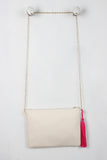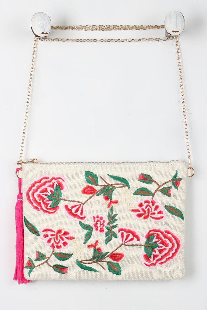 This cute bag features an embroidered floral design, long tassel with beads accent, top zipper closure with full lining, one inner zip pocket, and two slip pockets. Finished with a removable chain strap (24" drop).