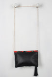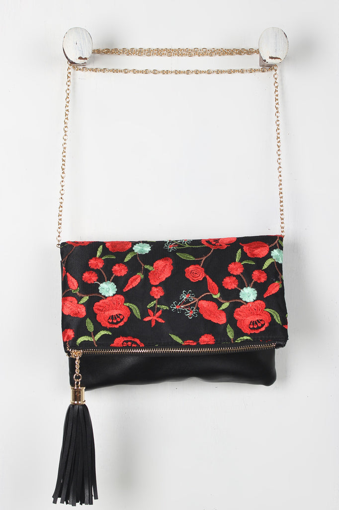 This chic clutch bag features embroidered floral designs, tassel accent, a top zipper with magnetic flap closure, one compartment underneath the flap, lined interior with one zipper pocket, and detachable shoulder chain strap (24" drop).