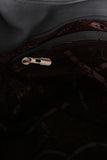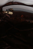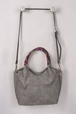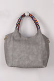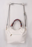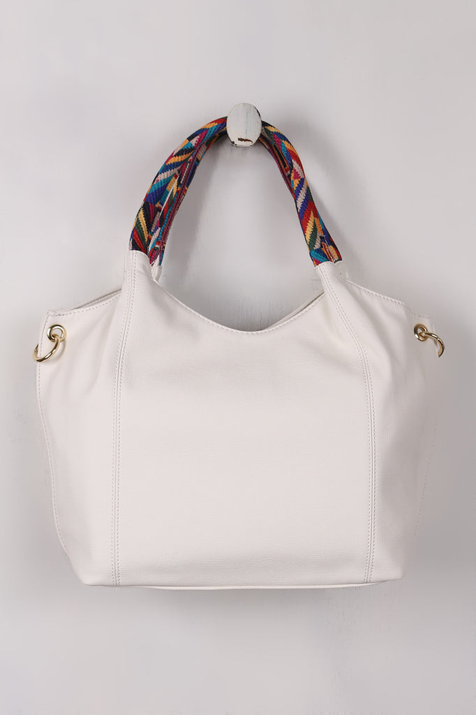 This bag features a vegan leather fabrication, one back zipper pocket, double handles with colorful woven detailing, and a removable adjustable cross body strap. Finished with fully lined interior with mixed print lining, two zipper pockets, three pouch pockets, and a top zipper closure.