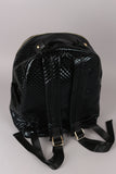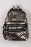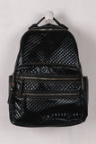 This trendy backpack features a vegan leather fabrication, shiny metallic quilted design, three zipper pockets at front, two side slip pockets, and main zipper closure. Interior is fully lined with a zipper pocket and two slip pockets. Finished with a top strap with stud accents and adjustable shoulder straps.