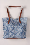 This reversible tote bag features a denim fabrication with an embroidered paisley design, vegan leather handles, and a magnetic button top closure. Includes an extra inner bag with a back zipper pocket, top zipper closure, one inner zipper pocket and two slip pockets. Finished with a vegan leather adjustable and removable shoulder strap.