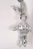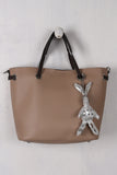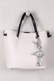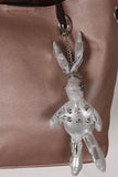 This tote bag features pebbled vegan leather fabrication and a detachable bunny keychain with embellishments. It has a magnetic button top closure, two handles with an adjustable and removable shoulder strap. Includes an extra inner bag with a top zipper closure.