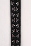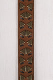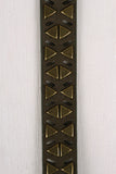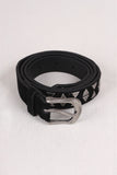 This belt features a vegan suede fabrication, slotted cut out design with triangle detail. and and and adjustable buckle closure.