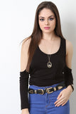 This belt features an elastic and vegan leather fabrication, etched belt buckles, and double snap closure.