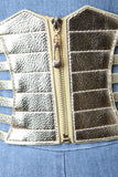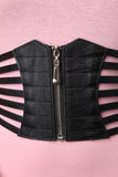 This belt features a vegan leather, elastic fabrication, cutout detailing, and a cage constructed front exposed zipper waist detail. 70% Polyurethane, 30% Latex Thread.