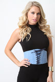 This corset belt features a denim fabrication, lace up front design and back snap closure. 40% Cotton, 30% Polyurethane, 30% Latex Thread.