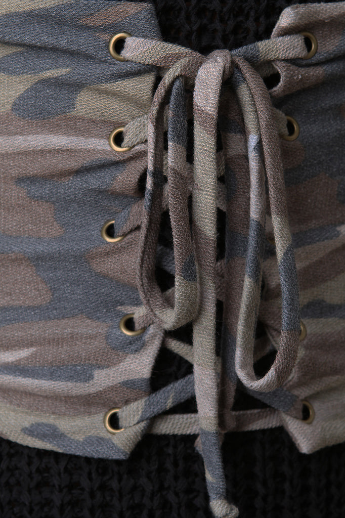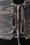 This corset belt features a camouflage print terry knit, self-tie lace-up front, vertical seams, and back zip closure. Made in U.S.A. 85% Polyester, 10% Rayon, 5% Spandex.