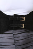 This harness corset belt features a vegan suede fabrication, buckle embellishments, velcro closure at front, partial elasticized back, and adjustable shoulder straps with belt buckles design.