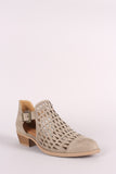 These edgy booties feature an almond toe, geometric-shaped cutouts, open side with buckle accents, and block stacked heel. Finished with a cushioned insole for comfort.