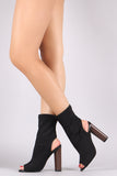 These fashionable booties feature a slightly stretched elastane fabric, peep toe silhouette, and back cutout design. Finished with a lightly padded insole and chunky stacked heel.