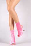 These ankle boots feature a soft crushed velvet, chunky lucite heel, peep toe silhouette, and side zipper closure. Completed with a slightly cushioned insole and soft lining.