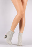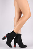 These stylish booties feature an almond toe silhouette, vegan suede upper with center seam detail, and embroidered floral accent chunky heel. Finished with a cushioned insole, soft lining, and convenient side zip closure.