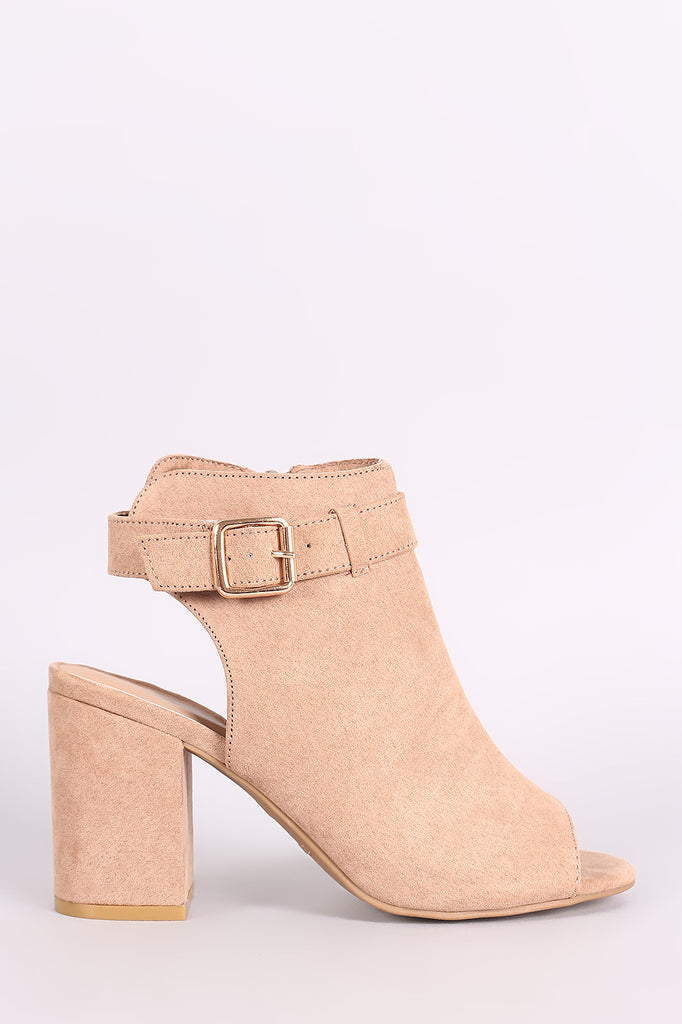 These booties features a peep toe silhouette and ankle strap with side buckle fastening. Finished with a covered chunky heel and side zipper closure. Lightly cushioned insole for comfort.
