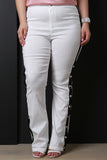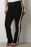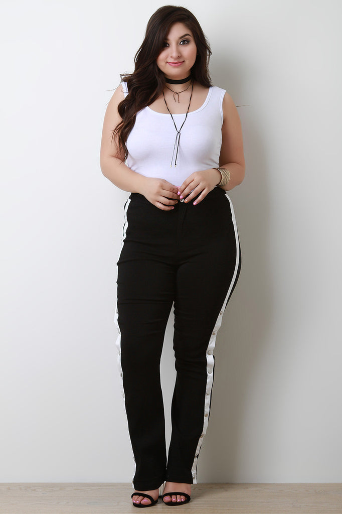 These high waisted pants feature a slightly stretchy knit fabrication, zipper fly with snap button closure, slightly flare legs construction, back decor pockets, and snap button-up sides. Accessories sold separately. 95% Polyester, 5% Spandex.