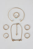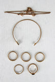 This ring set features two bracelets, one chain with an arrow charm and one open ended thin arrow cuff. Five rings, three double band designs, a triangle shaped faux stone and an open wrap around arrow ring.