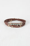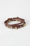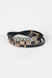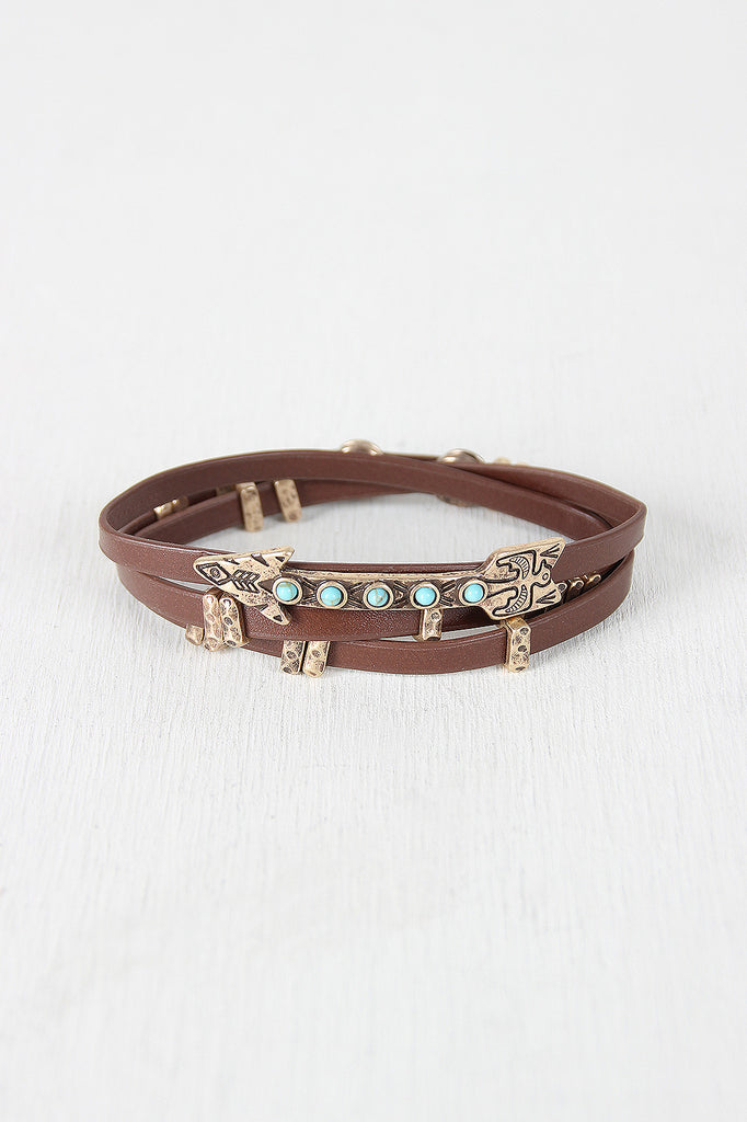 This wrap bracelet features a vegan leather fabrication, hammered square beads, and etched arrow with faux turquoise stones and a double snap closure.