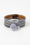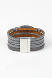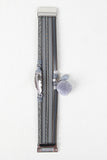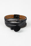 This bracelet features a vegan leather and mixed material fabrication, banded design, with a feather charm and a pom pom, Finished with a magnetic closure.