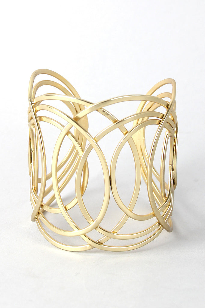 This cuff bracelet features overlapping ring loops design, matt finish, and an open end for easy on/off.