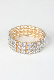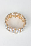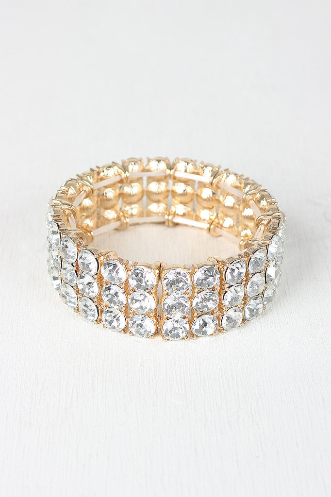 This elegant bracelet features three rows of rhinestones and easy slip on elastic construction.
