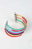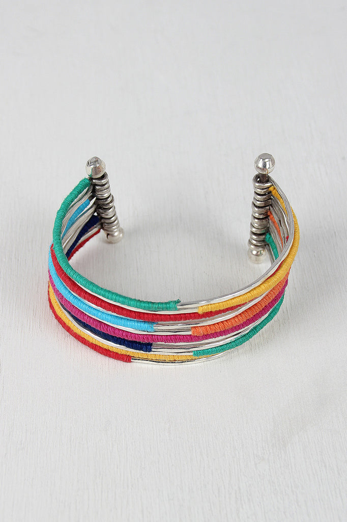 This cuff features 12-bracelets with hammered accents, multi-colored threaded details, and an open end for easy on/off.