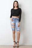 These denim bermuda shorts features an above the knee length, distressed cutouts, torn design, four pockets, belt loops, zipper fly, and a single button. Accessory sold separately. 97% Cotton, 3% Spandex.
