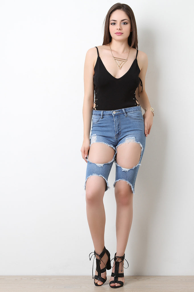 These denim bermuda shorts features an above the knee length, distressed cutouts, torn design, two faux front pockets, two back working pockets, belt loops, zipper fly, and a single button. Accessory sold separately. 97% Cotton, 3% Spandex.