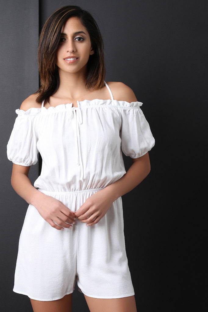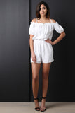 This lightweight romper features texture linen fabric, elasticized off-the-shoulder neckline with spaghetti shoulder straps, short sleeves, elastic cinched waist, and shorts bottom. Accessories sold separately. Made in U.S.A. 100% Rayon.