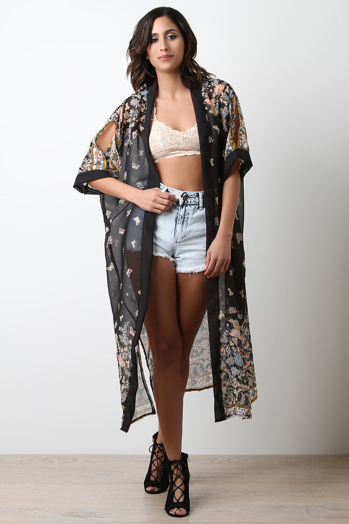 This cute longline kimono features semi-sheer mesh with floral and butterflies designs. Finished with an open front and cold shoulders with elbow length sleeves. Accessories sold separately. 100% Chiffon.