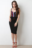 This midi skirt features a high waisted design, corset lace-up front, and stretchy sculpture fit. Accessory sold separately.