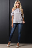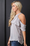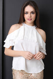 This top features satin fabrication, mock neckline, cold shoulders, ruffle accents, short sleeves, and back keyhole with a single button closure. Accessories sold separately. Made in U.S.A. 100% Polyester.