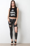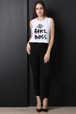 This top features a jersey knit, sleeveless construction, round neckline, "# Girl Boss" at front, and a cropped hemline. Accessory sold separately. Made in U.S.A. 60% Cotton, 40% Viscose.