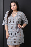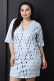 This plus size t-shirt dress features laser eyelet cutout with a thin stripe design, v-neckline with a mock neckline, elbow length sleeves, and a mini length hem. Accessory sold separately. Made in U.S.A. 64% Cotton, 36% Polyester.