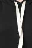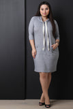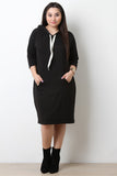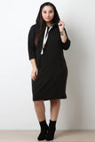 This plus size sweater dress features a jersey knit fabrication, hooded neckline with self-tie drawstring, front pouch pocket, three-quarter length sleeves, relaxed fit and a midi length hem. Accessories sold separately. 48% Polyester, 48% Rayon, 4% Spandex.
