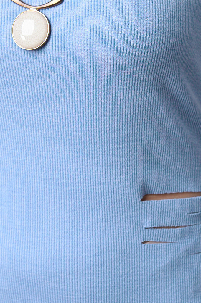 This dress features a ribbed knit fabrication with distress holes, round neckline, sleeveless, and midi length hemline. Accessory sold separately. 80% Polyester, 12% Rayon, 8% Spandex.