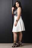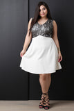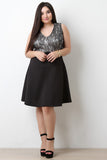 This gorgeous plus size fit & flare dress features a beautiful floral lace bodice, v neckline, sleeveless design, and flare skirt. Accessories sold separately. Made in U.S.A. 98% Polyester, 2% Spandex.