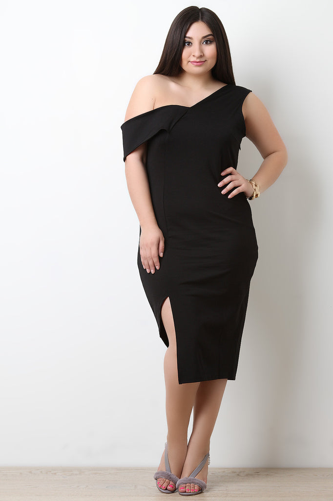 This lovely plus size dress features an asymmetrical one shoulder design, short flap sleeve, thick knit fabrication, front slit and a midi-length hem. Accessories sold separately. 100% Polyester.