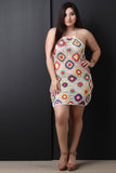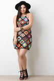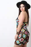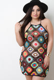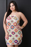 This cute plus size dress features a loose crochet knit with multi color floral designs, halter neckline, sleeveless construction, open crisscross back design, and a mini hemline. Accessory sold separately. 100% Rayon.