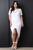 This dress features a jersey knit fabric, round neckline, short sleeves, sculpture fit, sharkbite hem, and high lighted with removable beaded necklace. Accessory sold separately. Made in U.S.A. 95% Rayon, 5% Spandex.