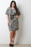 This plus size shift t-shirt dress features a french terry fabrication with camouflage print, round neckline, short sleeves, self-tie corset cinched waist, a relaxed fit, and a mini-length hemline. Accessory sold separately. Made in U.S.A. 86% Polyester, 10% Rayon, 4% Spandex.