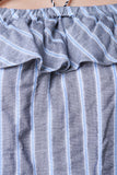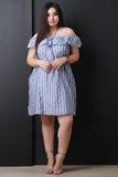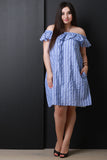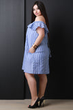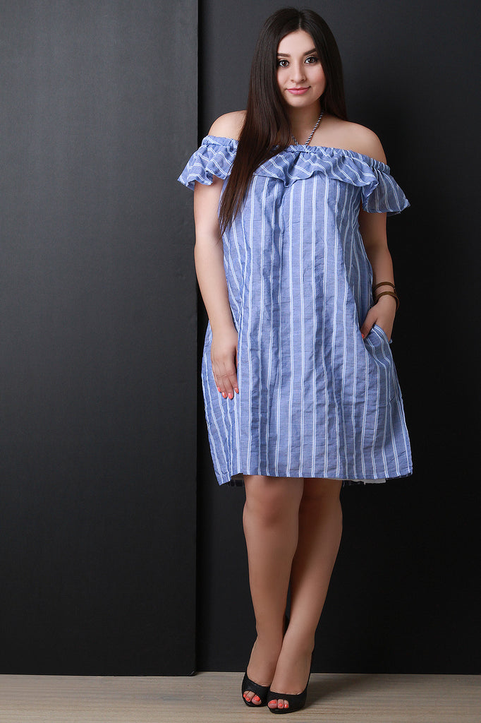This plus size dress features a striped pattern, ruffle overlay, elasticized off the shoulder neckline with a self-tie tassel for a halter neck look, short sleeves, two pockets, and midi length hemline. Finished with a back self-tie tassel closure. Accessories sold separately. 100% Cotton.