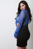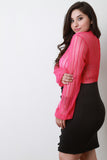 This plus size combo dress features a semi-sheer fabrication upper half with pinstripes, polka dots, mock neckline, and long bishop sleeves. Finished with double button closures at nape with keyhole cutout and contrasting bodycon skirt with corset lace up front. Accessory sold separately. Made in U.S.A. Self: 99% Nylon, 1% Spandex. Contrast: 95% Polyester, 5% Spandex.