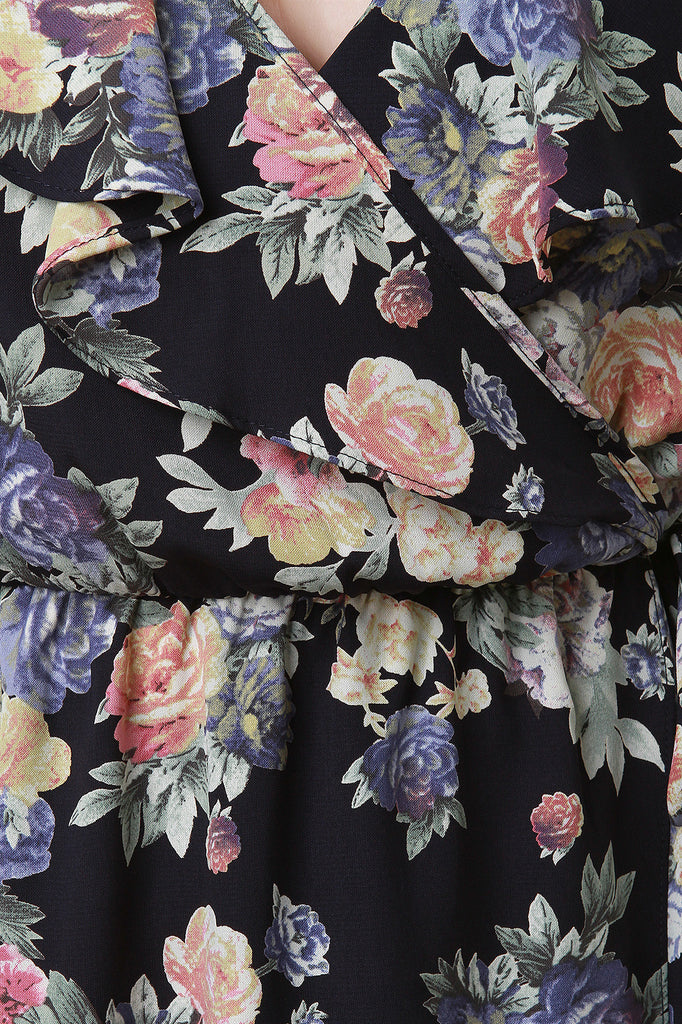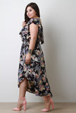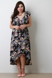 This plus size maxi dress features a floral pattern print, surplice neckline, flutter cap sleeves, elasticized self-tie cinched waist, high low hemline, ruffle accents, and an open back design with a strap detail. Accessories sold separately. Made in U.S.A. 100% Polyester.