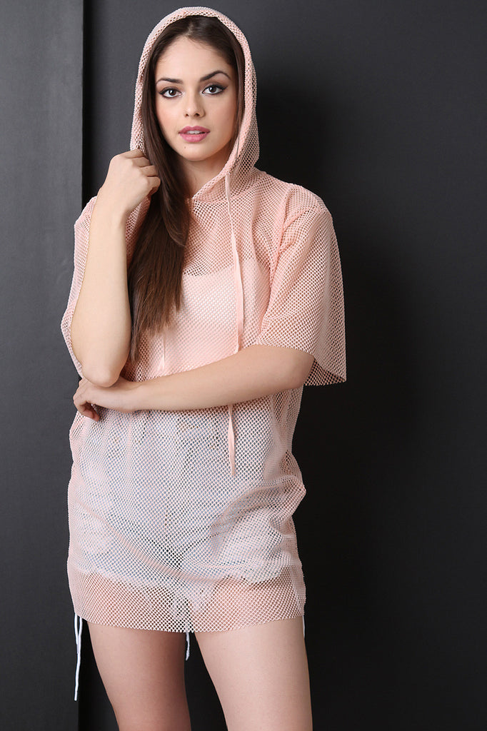 This semi-sheer dress features a netted design, drawstring hood, and short sleeves. Finished with a boxy-cut fit and raw hemline. Accessories sold separately. Made in U.S.A. 100% Polyester.