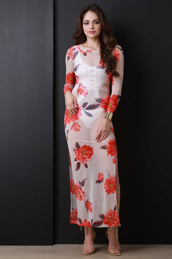 This maxi cover-up dress features bold contrasting floral print on semi-sheer mesh fabrication, round neckline, long sleeves, and high vent slits. Accessory sold separately. Made in U.S.A. 93% Polyester, 7% Spandex.